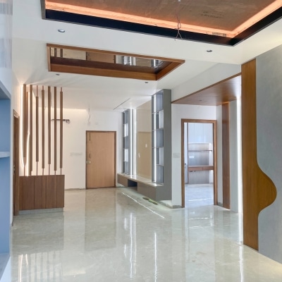 External: Textured finish and two coats of exterior emulsion paint, over a coat of primer of reputed brand. Internal: Smooth finish with two coats of putty, two coats of acrylic emulsion paint, over a coat of primer of reputed brand.